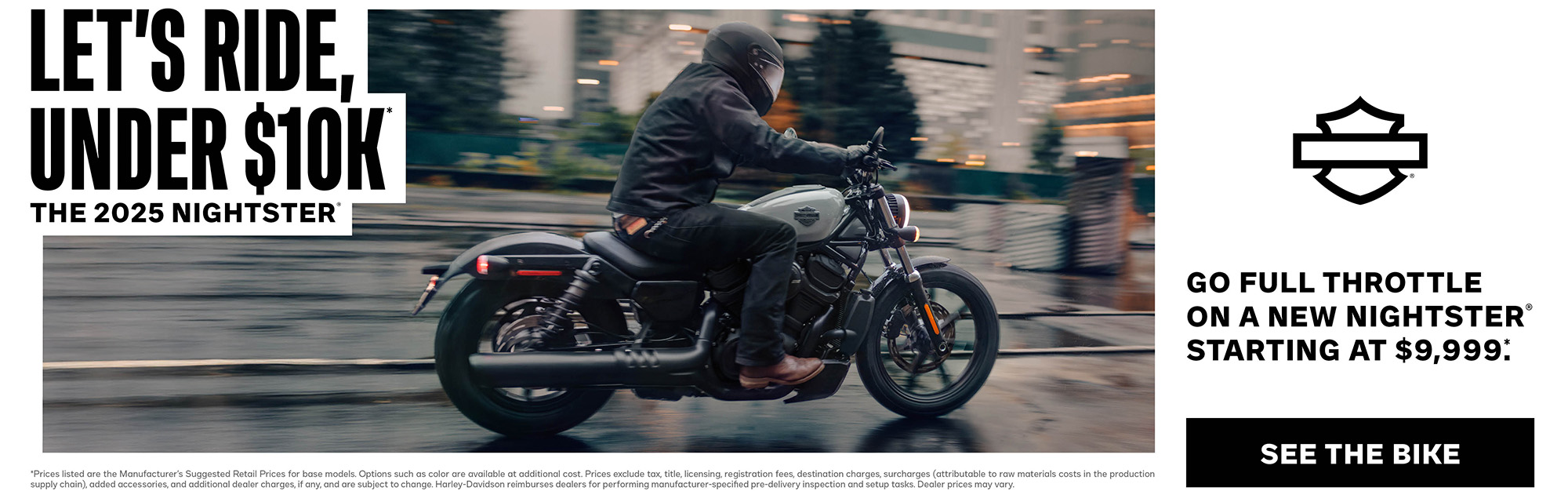 17. Financing Offer available only on new Harley-Davidson® motorcycles financed through Eaglemark Savings Bank (ESB) and is subject to credit approval. Not all applicants will qualify. This 10.99% offer is available on new Harley Davidson® motorcycles to high credit tier customers at ESB and only for up to an 84-month term. The APR may vary based on the applicant’s past credit performance and the term of the loan. For example, a 2025 Nightster® motorcycle in Billiard Gray with an MSRP of $9,999 a 10% down payment and amount financed of $8,999.10, 84-month repayment term, and 10.99% APR results in monthly payments of $154.04. In this example, customer is responsible for applicable taxes, title, licensing fees and any other fees or charges at the time of sale. APR is calculated according to the simple interest method. Not valid in conjunction with other offers. Other terms, conditions, and limitations may apply. Dealer participation may vary. Financing offer is subject to change or cancellation at any time. See your Harley-Davidson® Dealership for details.